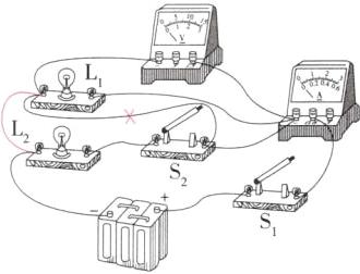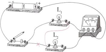 6.某位同学要用电压表测量串联电路中灯$L_2$两端的电压,连接电路如图所示,图中有一根导线连接错了,请你在连错的导线上打"×",并用笔画线代替导线,将电路连接正确。