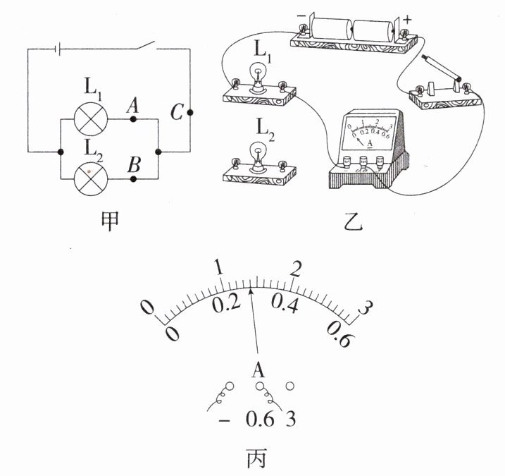 (2)用电流表分别测量A、B、C三点的电流,更换灯泡多次测量,将实验数据记录在表格中,其中第4次实验中B点的电流如图丙所示,则Iᵦ= ______A;分析数据可知:并联电路中电流的特点是______。
