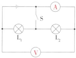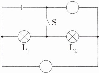 13. 将电压表和电流表的符号分别填入如图所示的电路中的圆圈内。要求:开关S断开时,小灯泡$L_1$和$L_2$都能发光;开关S闭合时$L_1$发光$,L_2$不发光。