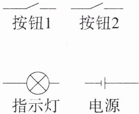 解析 按下任何一个按钮,指示灯都会发光,说明这两个开关互不影响,为并联,然后与电源、指示灯串联组成电路。