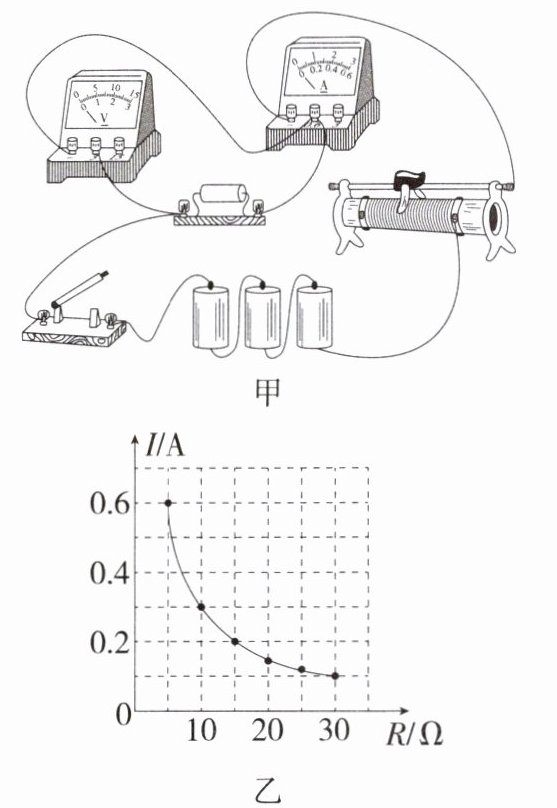 (选填"左"或"右")移动,直至电压表示数为3.0V。(3)根据如表所示实验数据,在图乙中描绘出I-R的关系图像,由图像可以得出结论: