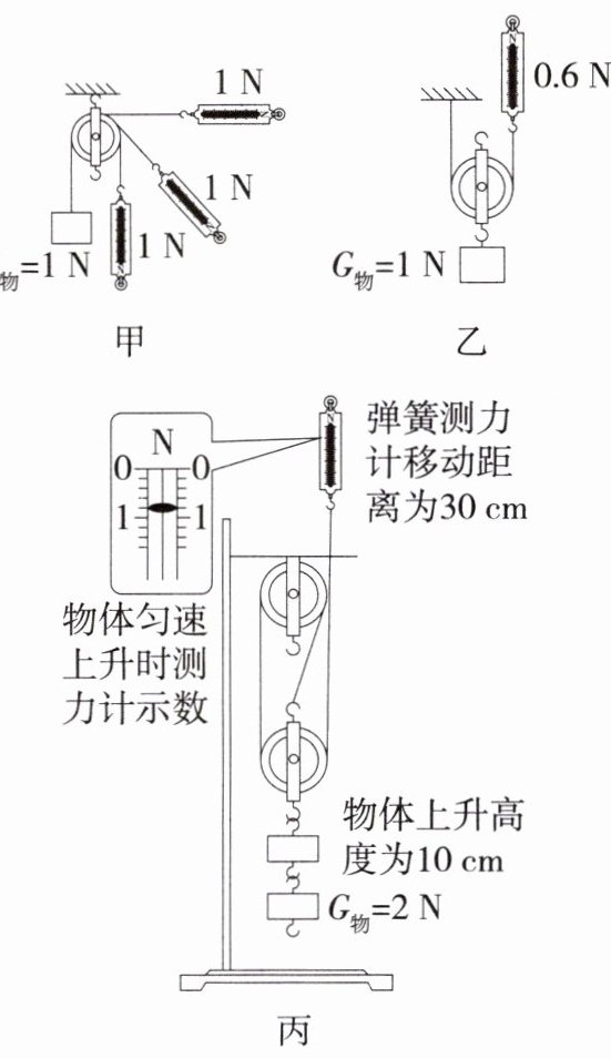 (3)组装滑轮组时,他们想:利用滑轮组提升重物能否省力呢?为此,他们进行了如丙图所示实验,物体的重力为2N,测力计的示数为0.8N,由图可知,利用滑轮组提升重物能