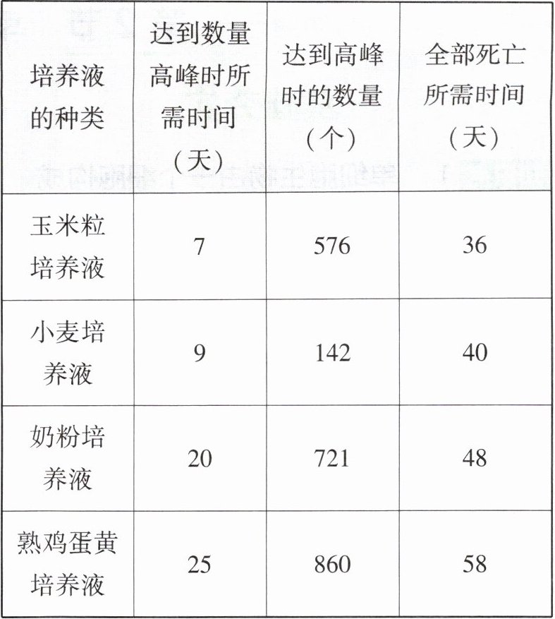 |培养液的种类|达到数量高峰时所需时间(天)|达到高峰时的数量(个)|全部死亡所需时间(天)|