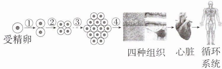 C 过程①表示细胞分裂,细胞分裂时,细胞核中的染色体先复制再均分到两个新细胞中,A错误。过程④为细胞分化形成组织,不同组织的细胞形态、结构和功能不同,遗传物质相同,B错误。循环系统由心脏和血管等器官组成,血液属于结缔组织,D错误。