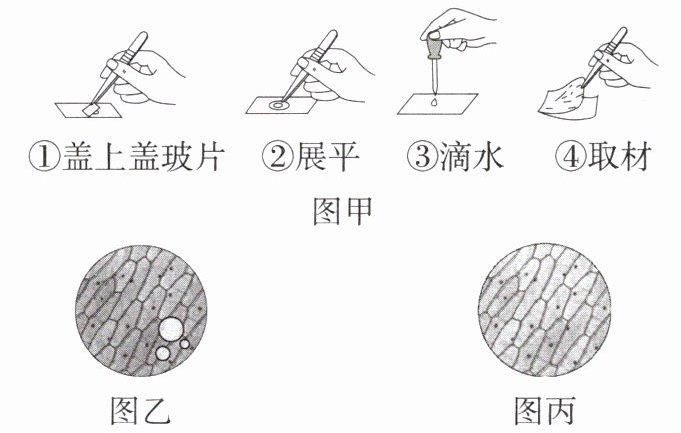 7. [2024江苏宿迁中考]细胞是生物体结构和功能的基本单位。用显微镜观察细胞的结构,通常需要将观察的标本制成临时装片。图甲是制作洋葱鳞片叶内表皮细胞临时装片的部分步骤,图乙、图丙是两位同学在显微镜下观察到的洋葱鳞片叶内表皮细胞的视野图。据图回答。