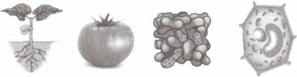 B 菜豆幼苗为植物体;西红柿属于果实,为器官;第三个图片是薄壁组织;第四个图片是植物细胞,B 正确。