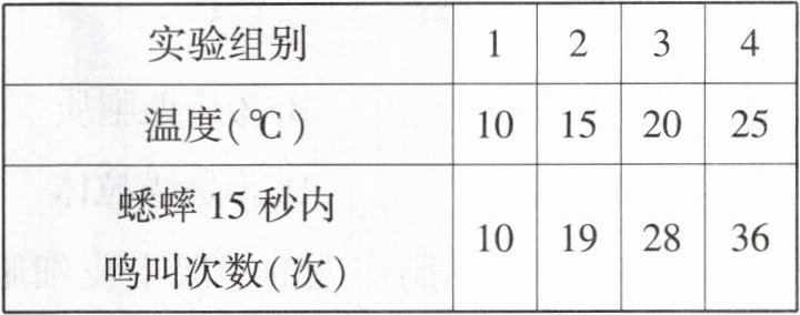 (3)10℃时,蟋蟀15 秒内鸣叫了10 次,15℃时,蟋蟀15 秒内鸣叫了19 次,20℃时,蟋蟀15 秒内鸣叫了28 次,25℃时蟋蟀15 秒内鸣叫了36 次,因此可得出的实验结论是:在一定温度范围内,温度越高蟋蟀鸣叫次数越多。