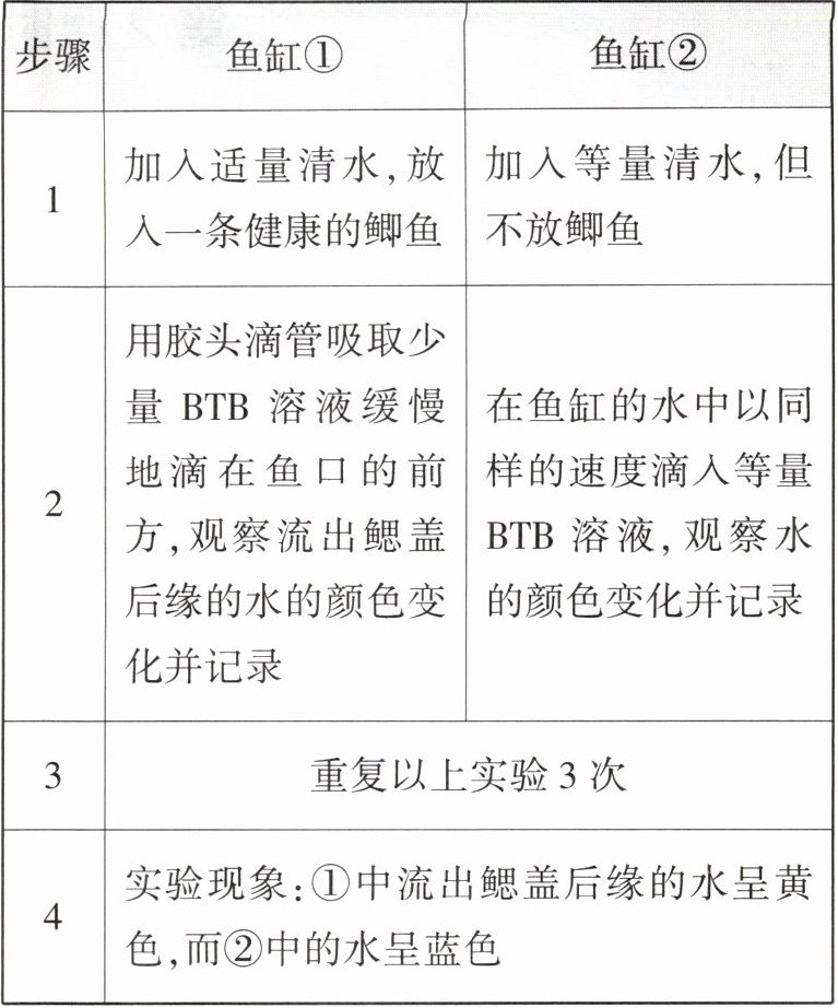 |2|用胶头滴管吸取少量BTB溶液缓慢地滴在鱼口的前方,观察流出鳃盖后缘的水的颜色变化并记录|在鱼缸的水中以同样的速度滴入等量BTB溶液,观察水的颜色变化并记录|