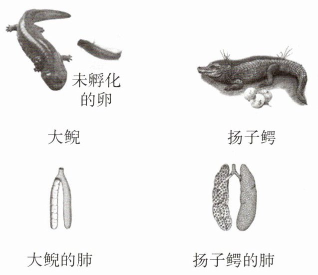 。(3)与大鲵的肺相比,扬子鳄的肺更大,肺泡数量更多,大大