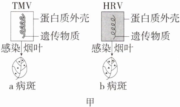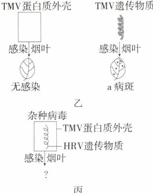 C 根据甲和乙的实验可知,蛋白质外壳不能使健康烟叶患病,而遗传物质能使健康烟叶患病;丙表示用TMV 蛋白质外壳和HRV 遗传物质合成的杂种病毒感染烟叶,烟叶会出现病斑,表现病症应为感染车前草病毒(HRV)的症状,即表现出b病斑,C符合题意。