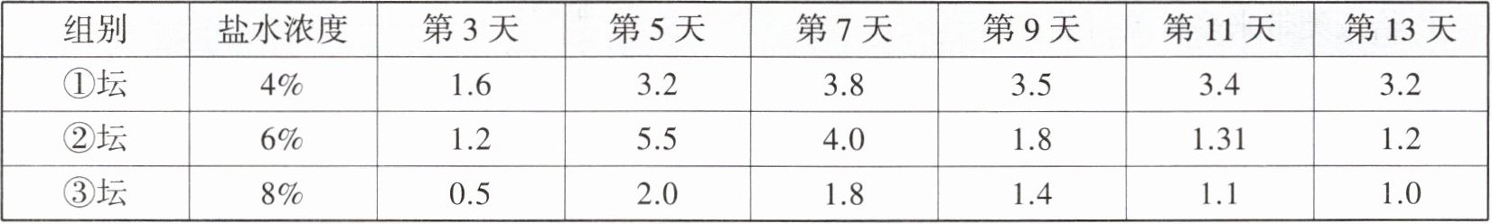 3. [2024 吉林长春朝阳期末] 泡菜的制作工艺是我国悠久的饮食文化遗产之一。腌制泡菜的过程中,应将亚硝酸盐浓度控制在一定范围内,以免对人体产生危害。《食品安全国家标准食品中污染物限量》(GB 2762-2022)中规定:蔬菜及其制品中亚硝酸盐含量应不超过 20 mg/kg。如表是某兴趣小组探究“盐水浓度对泡菜发酵过程中亚硝酸盐含量的影响”得到的数据,请分析回答:
