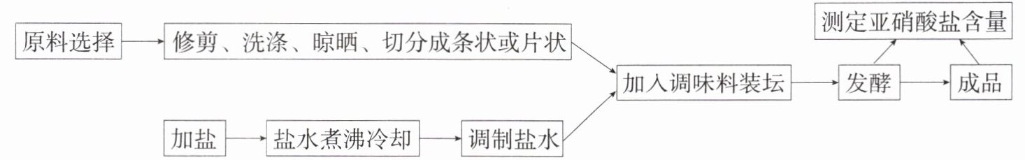 原料选择→修剪、洗涤、晾晒、切分成条状或片状→加入调味料装坛→发酵→成品→测定亚硝酸盐含量