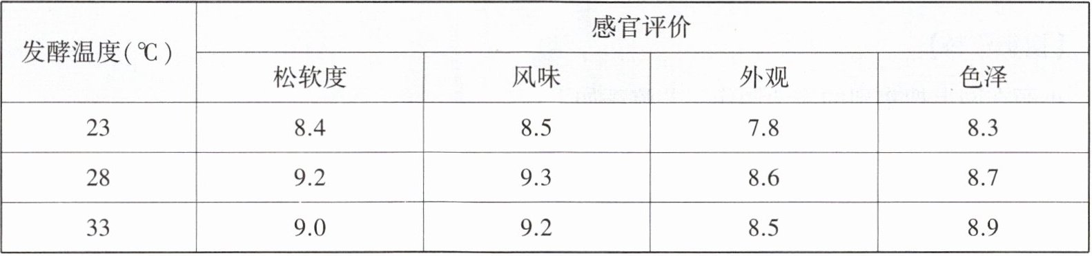 要想获得松软度、风味和外观最优的馒头,由上表可知,应选择的发酵温度是