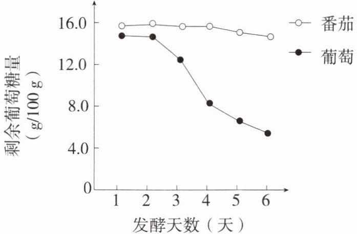 (1)筛选菌种:将葡萄和番茄果实表面的酵母菌分别与葡萄糖溶液混合,检测它们的发酵能力,结果如图。据结果分析,小明应选用