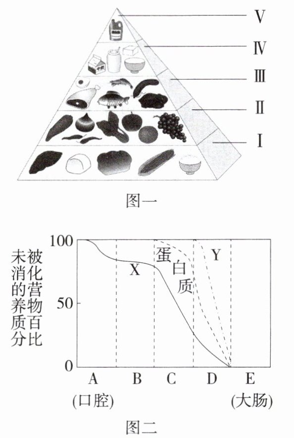 (1)蛋白质 Ⅲ、Ⅳ(2)小肠 X 葡萄糖解析 (1)牛奶中含有丰富的蛋白质。青少年正处于生长发育的关键时期,对蛋白质的需求量较大。图一“平衡膳食宝塔”中的Ⅲ类和Ⅳ类食物含有丰富的蛋白质,应适当多吃。(2)小肠是人体消化和吸收营养物质的主要场所。由图二可知,蛋白质、淀粉、脂肪都是在图二中的部位D被彻底消化,故D是小肠。淀粉的消化从口腔开始,最终在小肠内彻底分解为葡萄糖,所以X曲线表示淀粉的消化过程。
