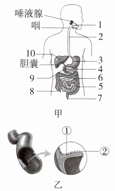 (1)1 口腔 10 肝(2)6 小肠 皱襞 小肠绒毛 小肠内的肠液和胰液含有多种消化酶(3)蛋白质 3 胃 氨基酸解析 (1)食物中淀粉的消化开始于图甲中的1口腔。10肝分泌的胆汁要经胆囊输送给小肠,从而促进脂肪的消化。(2)6小肠是消化食物和吸收营养物质的主要场所。小肠内表面有许多①皱襞,①皱襞的表面又有很多突起②小肠绒毛。小肠内的肠液和胰液含有多种消化酶,能够消化多种营养物质,故小肠是消化食物的主要场所。(3)牛肉和鸡蛋中含有丰富的蛋白质,蛋白质是构成人体细胞的基本物质。蛋白质在3胃内得到初步消化,最终在小肠内彻底分解成氨基酸被人体吸收。