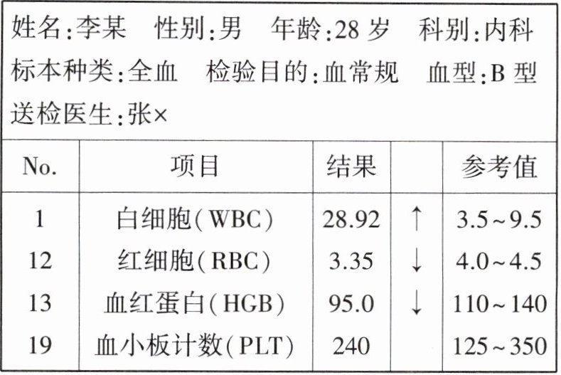 | 1 | 白细胞(WBC) | 28.92 ↑ | 3.5~9.5 |