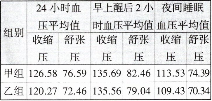 ④测量并统计甲、乙两组所有患者每天 24 小时血压的平均值、早上醒后 2 小时血压的平均值和夜间睡眠期间血压的平均值。结果如表(单位均为 mmHg)。