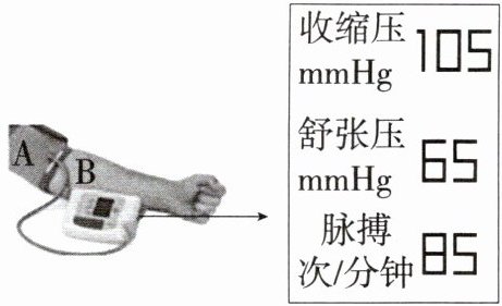 D 人每分钟脉搏的次数与心跳的次数一致,会受运动和情绪的影响,A错误;血压测量一般测的是体循环的动脉血压,动脉内血流方向为A→B,B错误;该男性检测结果中收缩压为105 mmHg,舒张压为65 mmHg,均在正常参考值范围内,没有患高血压,C错误。