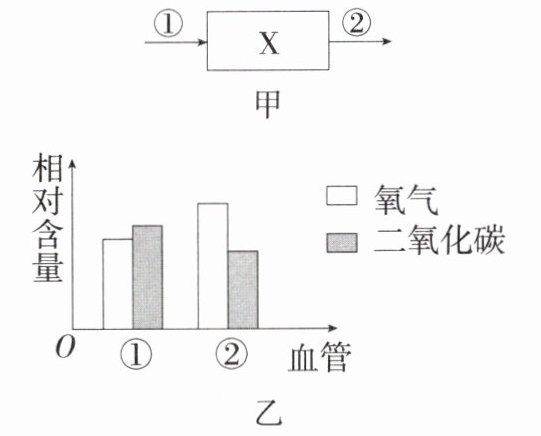 D 根据图甲中血液流动方向可知,①是动脉,②是静脉。分析图乙可知,①血管中流静脉血,②血管中流动脉血。由此可以推断:血管①为肺动脉,血管②为肺静脉,X表示肺。