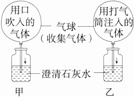 (填“甲组”或“乙组”)中的气体相当于人体的“吸入气体”。(3)实验结果显示,甲组澄清石灰水变混浊,乙组不变混浊,说明人体呼出的气体与吸入的气体相比,二氧化碳含量明显