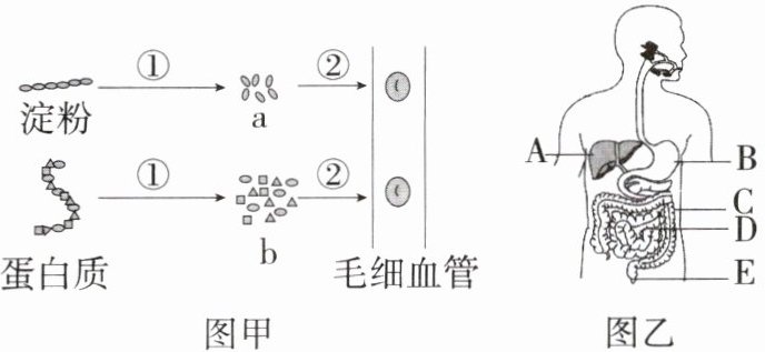 (1)根据题图可知,图甲中的①过程是将大分子物质变为小分子物质,表示营养物质的消化;②过程是小分子物质进入毛细血管,表示营养物质的吸收。