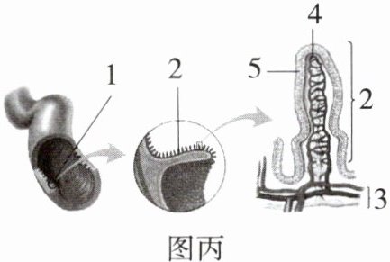 21.[2024甘肃武威凉州三模](8分)图甲是淀粉、蛋白质在人体消化系统中的变化示意图,图乙是消化系统模式图,图丙是小肠结构示意图。请据图回答: