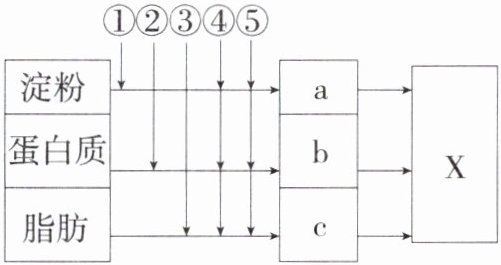 9.[2025 山东莱芜期中]如图为人体消化、吸收的过程示意图,①~⑤分别表示不同的消化液(④为肠液)。纵向箭头表示消化液对相应营养物质的消化作用,a、b、c 分别表示淀粉、蛋白质和脂肪的最终消化产物。下列有关叙述正确的是 (