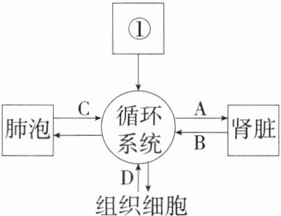 1.[2024山东济南槐荫期中] 如图所示,A、B、C、D表示与人体新陈代谢相关的生理过程,①代表人体的某一系统。下列说法中错误的是 (