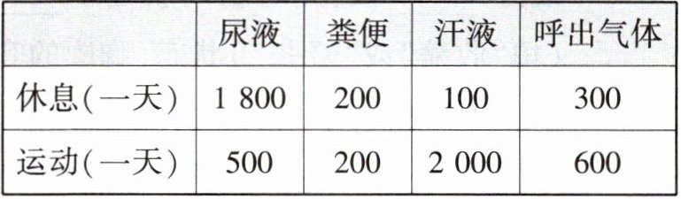 15.[2024河南信阳一模]在环境和进食相同的条件下,测定某人在休息和运动两种状态下,通过不同途径所散失的水分,结果如下表所示,下列分析错误的是(