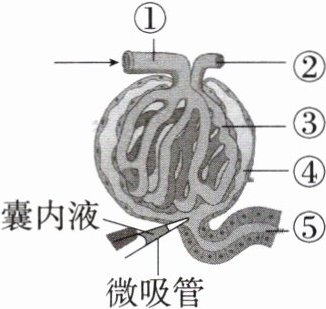 D 由题图可知,③肾小球、④肾小囊、⑤肾小管组成了一个肾单位,A错误;入球小动脉和出球小动脉中都流动脉血,B错误;④是肾小囊,从中抽出的囊内液是原尿,C错误;正常情况下,血液中的大分子蛋白质和血细胞不能被肾小球滤过,囊内液中发现大分子蛋白质,说明③肾小球可能病变,D正确。