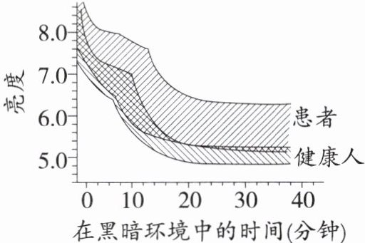 资料二:长期患慢性肠炎的人易出现营养不良。科研人员对慢性肠炎患者和健康人的视力进行测试,让患者和健康人处于黑暗环境中,持续测试并记录他们看清物体所需的最低亮度,结果如图所示。