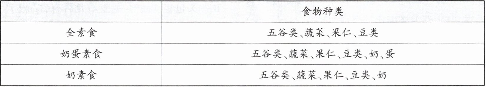 资料一:为了减肥,有些人开始将饮食侧重点转向素食,这种饮食方式是否更有利于健康,是值得探讨的问题。素食一般分为如下表三类: