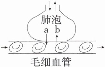 5.新中考识图分析题[2024 青海西宁中考]如图是肺泡与血液之间的气体交换示意图,其中 a、b 表示气体。下列有关叙述不正确的是(