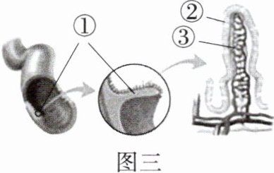 (3)图三中小肠内表面有许多环形[ ]______和小肠绒毛,使小肠的表面积增大,小肠绒毛内含有丰富的毛细血管和毛细淋巴管,小肠绒毛壁、毛细血管壁、毛细淋巴管的壁都很薄,仅由一层上皮细胞构成,有利于______。