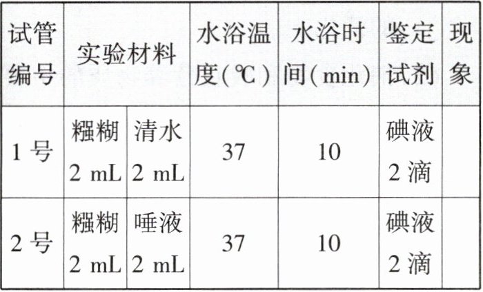 |2号|糨糊2mL唾液2mL|37|10|碘液2滴| |