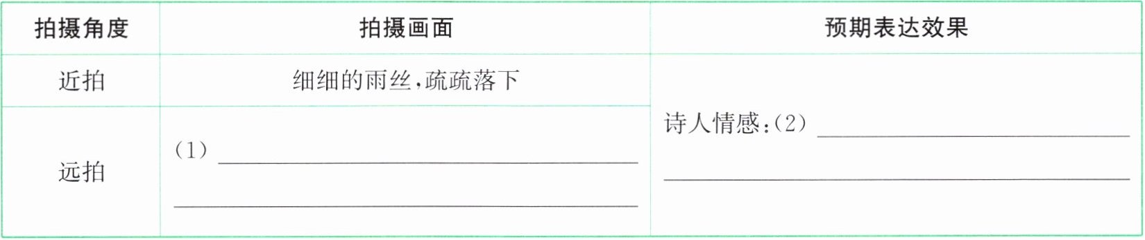 2. 小语特别喜欢诗歌的三、四句,他准备将其拍摄成一个微视频。请结合全诗,借助想象,帮助他完成拍摄脚本。