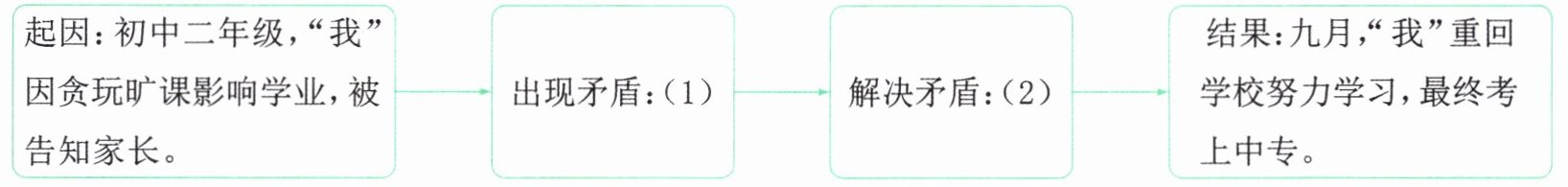 | 起因:初中二年级,“我”因贪玩旷课影响学业,被告知家长。 | 出现矛盾:(1)______ | 解决矛盾:(2)______ | 结果:九月,“我”重回学校努力学习,最终考上中专。 |