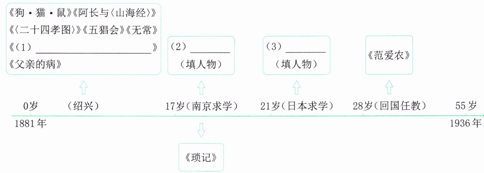 《狗·猫·鼠》《阿长与〈山海经〉》《〈二十四孝图〉》《五猖会》《无常》《(1)______》《父亲的病》 → (2)______(填人物) → (3)______(填人物) → 《范爱农》