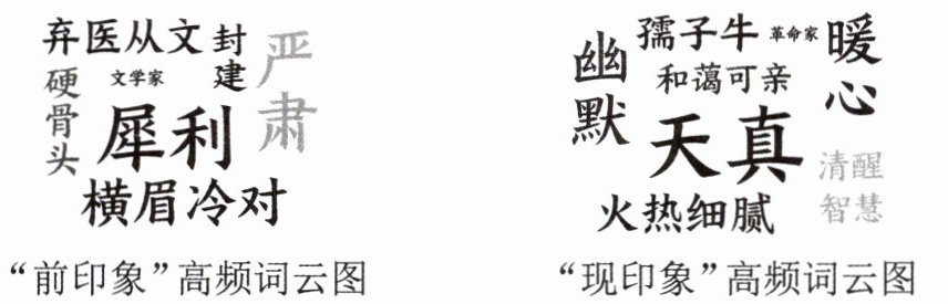 “前印象”高频词云图:弃医从文 封建 严肃 硬骨头 犀利 横眉冷对