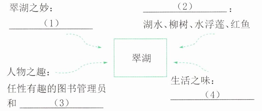 | 翠湖之妙:(1)______ | (2)______:湖水、柳树、水浮莲、红鱼 | 人物之趣:任性有趣的图书管理员和(3)______ | 生活之味:(4)______ |