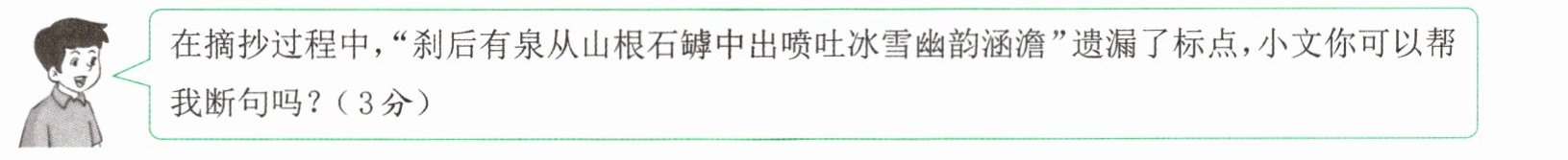 在摘抄过程中,“刹后有泉从山根石罅中出喷吐冰雪幽韵涵澹”遗漏了标点,小文你可以帮我断句吗?(3分)