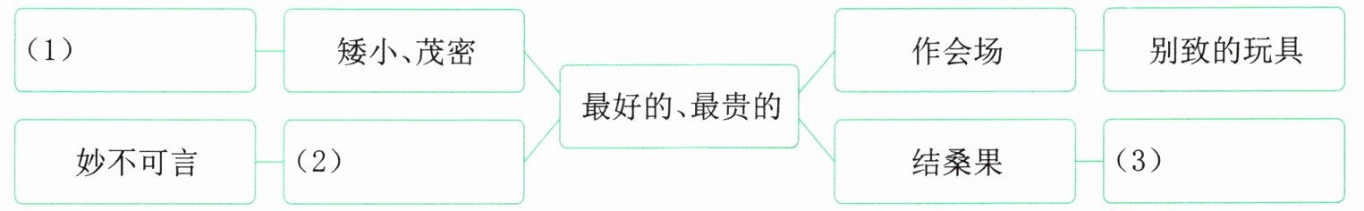 妙不可言 ← (2)______ → 最好的、最贵的 → 作会场 → 别致的玩具