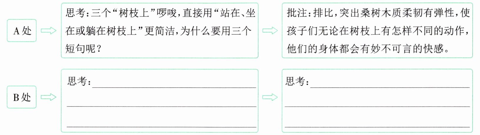 批注:排比,突出桑树木质柔韧有弹性,使孩子们无论在树枝上有怎样不同的动作,他们的身体都会有妙不可言的快感。