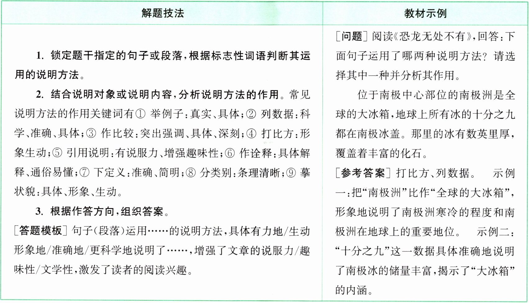 | 1. 锁定题干指定的句子或段落,根据标志性词语判断其运用的说明方法。2. 结合说明对象或说明内容,分析说明方法的作用。常见说明方法的作用关键词有① 举例子:真实、具体;② 列数据:科学、准确、具体;③ 作比较:突出强调、具体、深刻;④ 打比方:形象生动;⑤ 引用说明:有说服力、增强趣味性;⑥ 作诠释:具体解释、通俗易懂;⑦ 下定义:准确、简明;⑧ 分类别:条理清晰;⑨ 摹状貌:具体、形象、生动。3. 根据作答方向,组织答案。[答题模板] 句子(段落)运用……的说明方法,具体有力地/生动形象地/准确地/更科学地说明了……,增强了文章的说服力/趣味性/文学性,激发了读者的阅读兴趣。 | [问题] 阅读《恐龙无处不有》,回答:下面句子运用了哪两种说明方法?请选择其中一种并分析其作用。位于南极中心部位的南极洲是全球的大冰箱,地球上所有冰的十分之九都在南极冰盖。那里的冰有数英里厚,覆盖着丰富的化石。[参考答案] 打比方、列数据。 示例一:把“南极洲”比作“全球的大冰箱”,形象地说明了南极洲寒冷的程度和南极洲在地球上的重要地位。 示例二:“十分之九”这一数据具体准确地说明了南极冰的储量丰富,揭示了“大冰箱”的内涵。 |