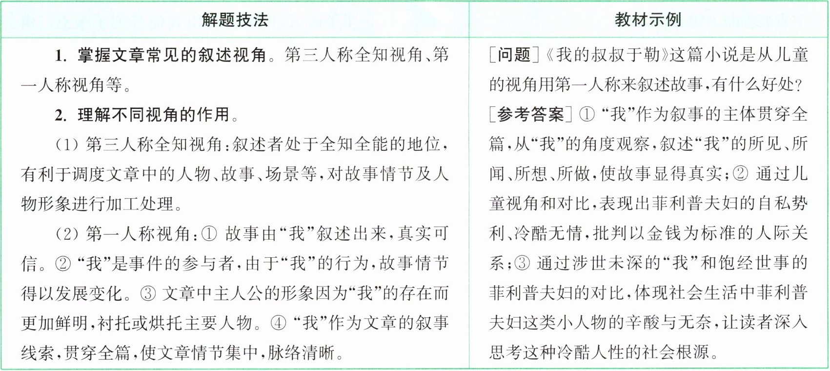 |1. 掌握文章常见的叙述视角。第三人称全知视角、第一人称视角等。2. 理解不同视角的作用。(1)第三人称全知视角:叙述者处于全知全能的地位,有利于调度文章中的人物、故事、场景等,对故事情节及人物形象进行加工处理。(2)第一人称视角:① 故事由“我”叙述出来,真实可信。② “我”是事件的参与者,由于“我”的行为,故事情节得以发展变化。③ 文章中主人公的形象因为“我”的存在而更加鲜明,衬托或烘托主要人物。④ “我”作为文章的叙事线索,贯穿全篇,使文章情节集中,脉络清晰。3. 结合文章具体内容,阐述对应人称的作用。|[问题]《我的叔叔于勒》这篇小说是从儿童的视角用第一人称来叙述故事,有什么好处?[参考答案] ① “我”作为叙事的主体贯穿全篇,从“我”的角度观察,叙述“我”的所见、所闻、所想、所做,使故事显得真实;② 通过儿童视角和对比,表现出菲利普夫妇的自私势利、冷酷无情,批判以金钱为标准的人际关系;③ 通过涉世未深的“我”和饱经世事的菲利普夫妇的对比,体现社会生活中菲利普夫妇这类小人物的辛酸与无奈,让读者深入思考这种冷酷人性的社会根源。|