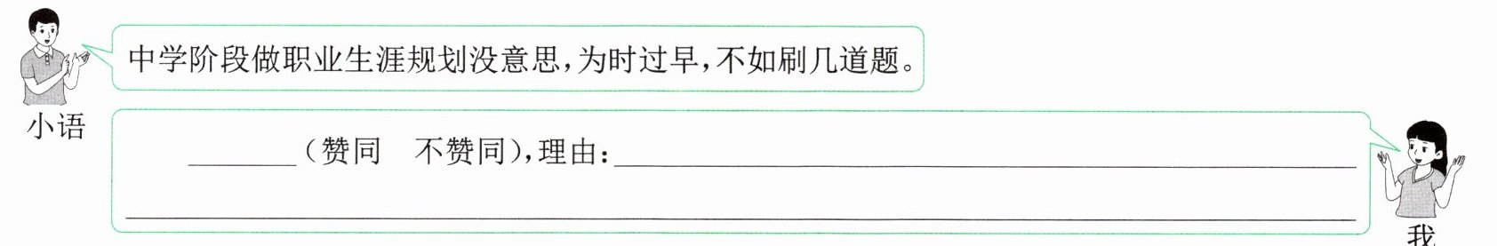 8. 不赞同(1分)① 职业生涯规划是一个持续渐进的过程,由童年开始,一直伴随个人的一生;② 职业生涯规划可以帮助我们更加了解自己,了解周围环境,进而减少职业选择中的失误;③ 越早做职业生涯规划,可以越早树立人生目标。(每点1分)