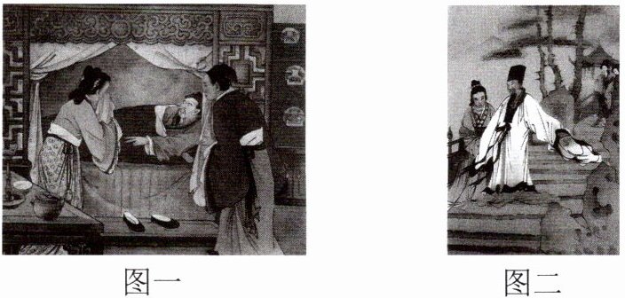 12.(1)D B A(每空1分) (2)图一:严监生在临死时因为看到家人点了两茎灯草,觉得浪费,一直不咽气。由此看出他是一个吝啬的人。(2分) 图二:杜少卿喝醉酒之后与娘子同游清凉山。由此可以看出他是一个尊重妇女(或:离经叛道、蔑视封建礼法)的人。(2分) (3)示例:第三回"周学道校士拔真才"是说周进担任广东学道时,反复阅读范进的文章,将他填为第一名,可是范进连苏轼是谁都不知道,可见他并无真才实学,并非被埋没的人才,周进把他当作真才,可见周进也是无才之人。(2分)作者用"拔真才"三个字,达到了巨大的讽刺效果。(1分)