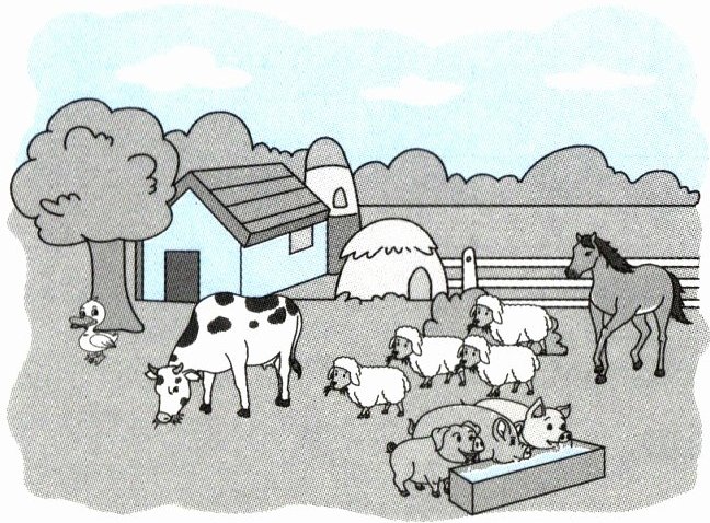 九 根据图片提示,写一篇短文介绍农场上有哪些动物,并介绍其中两种动物的特点,可适当拓展。