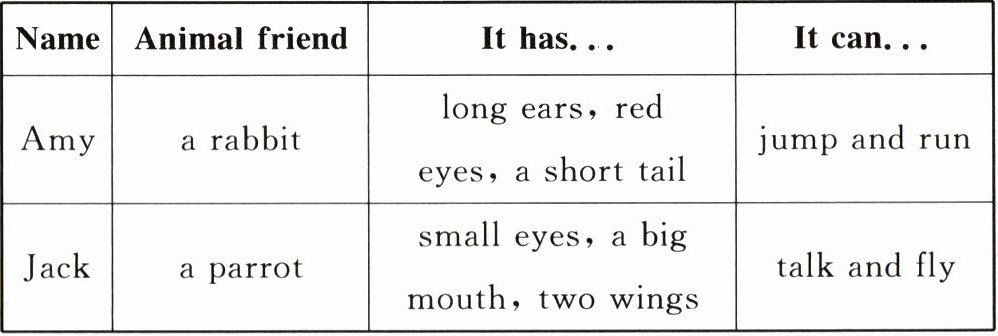 Amy and Jack are good friends. They like animals and they have animal friends. Amy has a beautiful rabbit. It has long ears and red eyes. It's white. It has a short tail. It can jump and run. Jack has a funny parrot. It has a big mouth and small eyes. It has two wings. It can talk and fly. They love their animal friends.